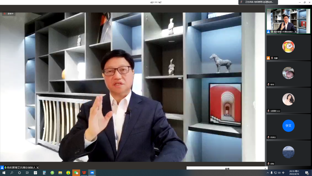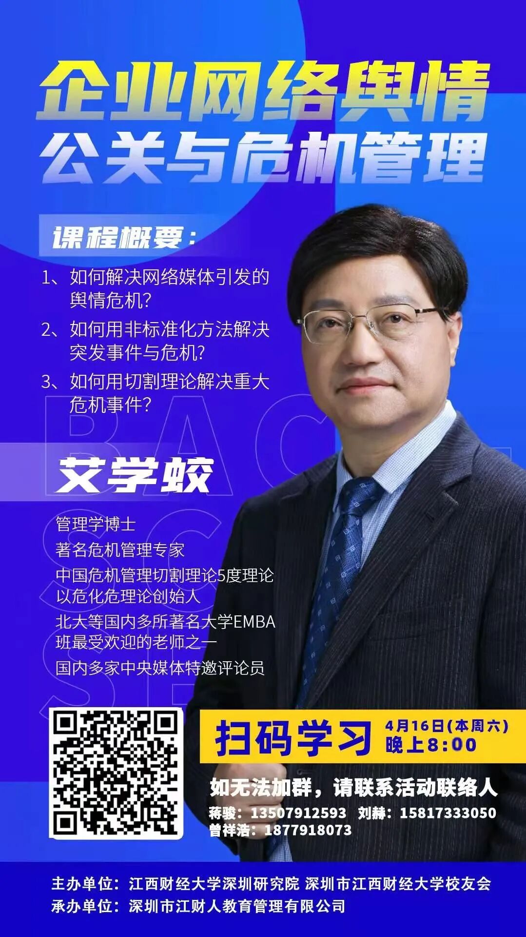 2022年4月16日晚,由江西财经大学深圳研究院和深圳市江西财经大学校友会联合主办,深圳市江财人教育管理有限公司承办的《企业网络舆情公关与危机管理》主题讲座,以腾讯会议线上直播的形式成功举办。本次讲座由江西财经大学深圳研究院吴良平院长特邀著名危机管理专家、管理学博士艾学蛟教授担任主讲,近300位校友参加了本次线上活动,由05级工商管理专业校友冷丽君担任主持。