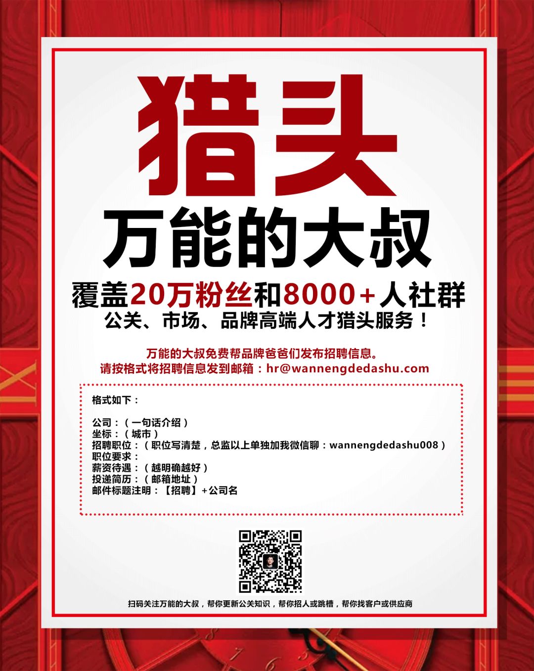 如果你是企业招聘方或者猎头,要找高端职位,包括市场营销(媒介/新媒体/公关/文案)等方面人才,请联系万能的大叔团队微信:tiaotiao610,会有专人跟进。