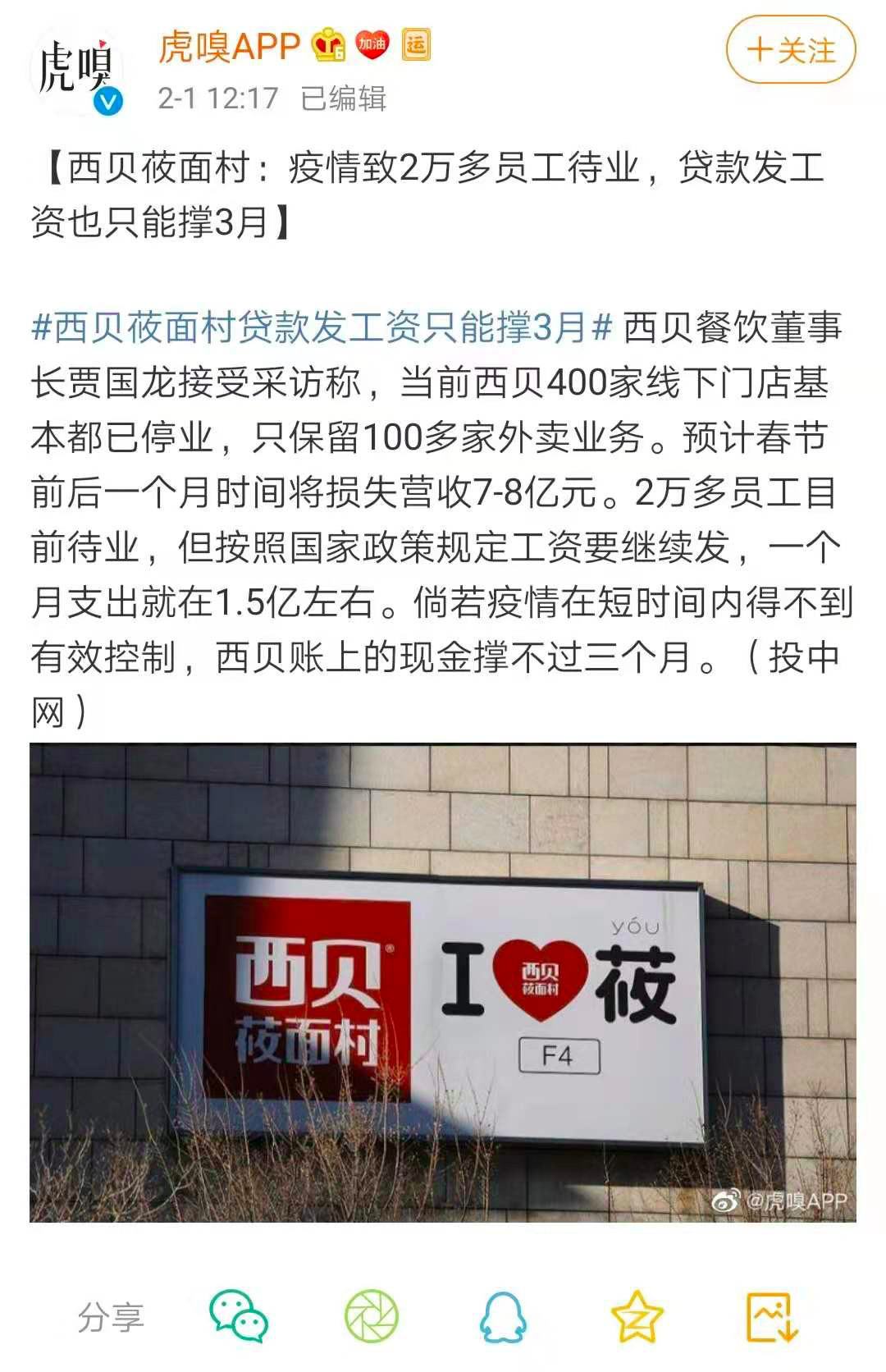 2月1日,西贝创始人贾国龙以一篇《西贝贾国龙:疫情致2万多员工待业贷款发工资能撑3月》公开发声叫苦,家里真的没有余粮了,引发全民关注。