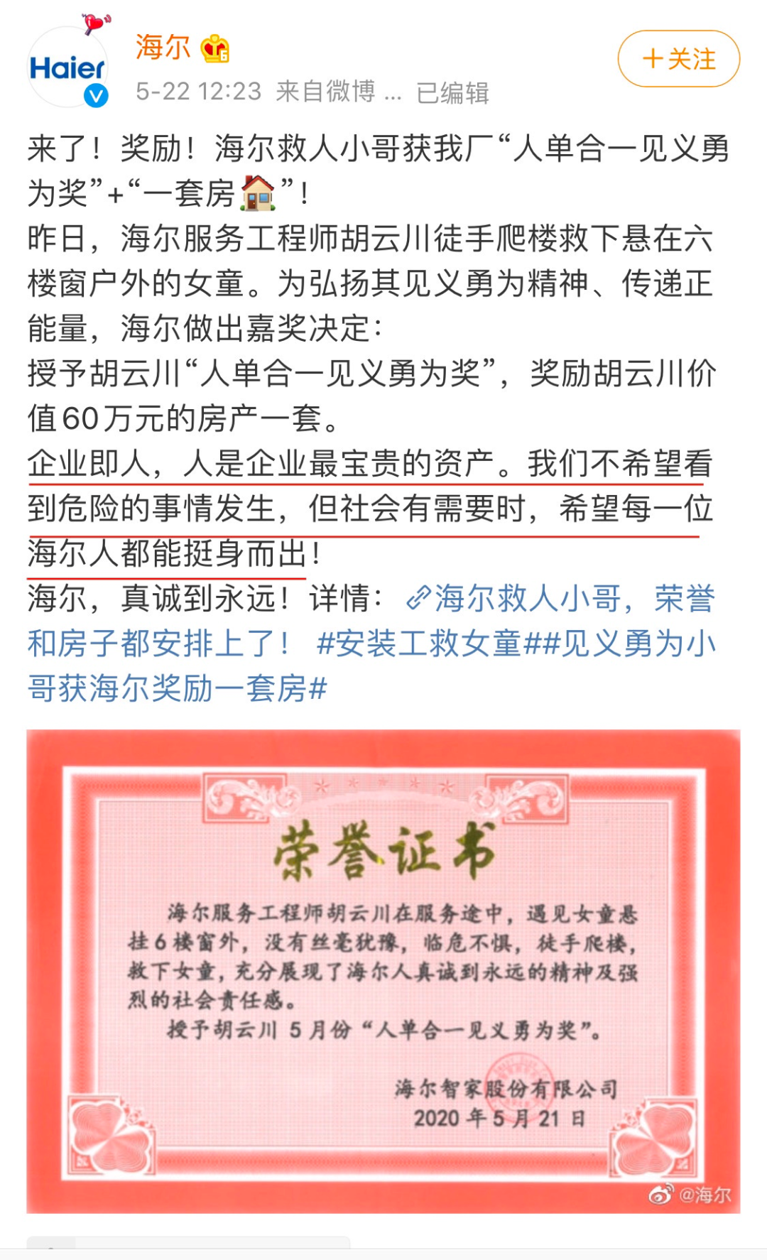 5月21日,海尔在官方微博第一个时间认领自家员工,同时在发布后续奖励措施:奖励小哥胡云川人单合一见义勇为奖,以及当地价值60万元的一套房。这一举措,不仅带来了极强的传播效果,也拔高了自身的品牌形象。