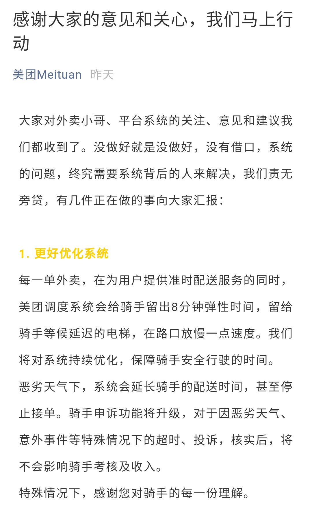 饿了么很快就作出回应,但彻底翻车了;相比之下,美团可以用一个稳字来形容,不主动承诺,还吸取了饿了么的教训,来一个波开卷考。
