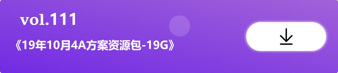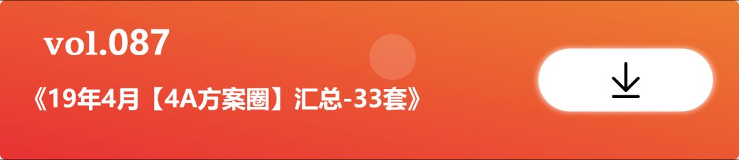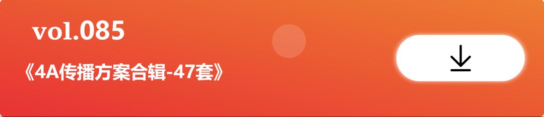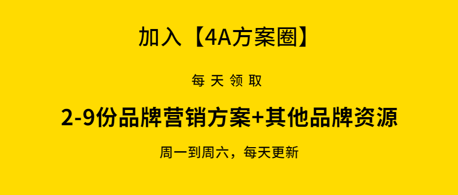 每月更新4-10期专属4A方案专题合集系列,包括:品牌定位、品牌策略、品牌推广、公关传播、社会化传播、新媒体传播、借势营销、造势营销、IP营销、内容营销、娱乐营销、事件营销、数据营销、公益营销、跨界营销、电商营销、汽车营销、化妆品营销、快消品营销、互动营销、粉丝增长、流量经济、台网联动、KOL代言等等等。(截止到2019年9月17日,已整理121期专题)