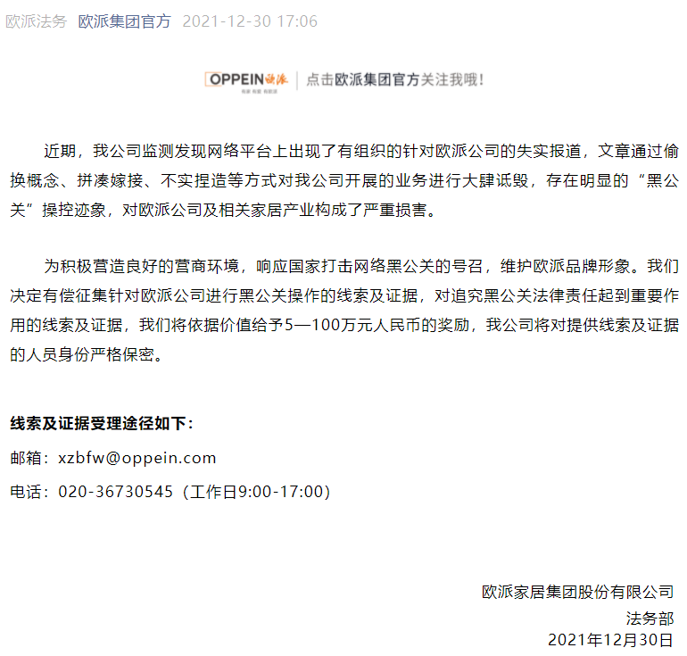 12月30日,欧派家居法务部发布公告称:近期,我公司监测发现网络平台上出现了有组织的针对欧派公司的失实报道,文章通过偷换概念、拼凑嫁接、不实捏造等方式对我公司开展的业务进行大肆诋毁,存在明显的黑公关操控迹象,对欧派公司及相关家居产业构成了严重损害。