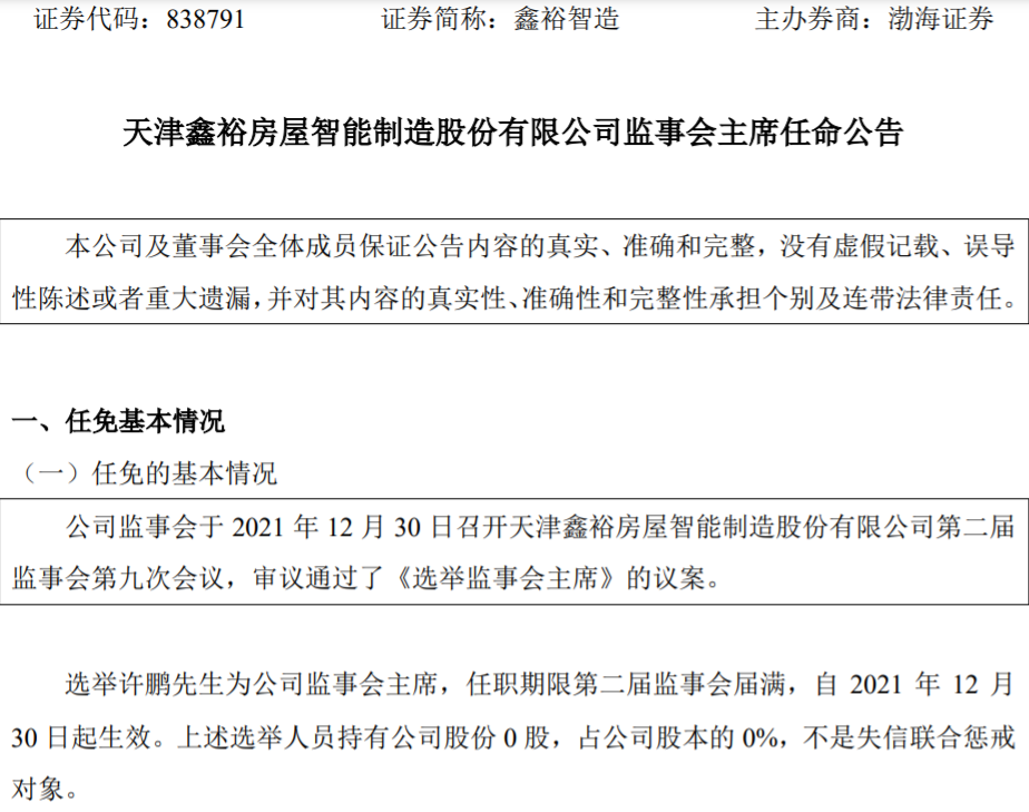 1月4日,鑫裕智造(838791.NQ)发布公告称,因公司原监事会主席陈旭由于个人原因辞去监事会主席职务,现选举许鹏为新任公司监事会主席。