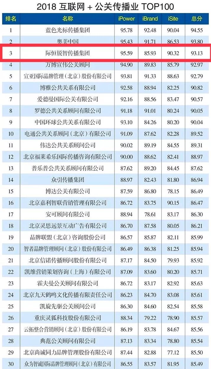 近日,中国最知名的互联网和IT界商业杂志之一《互联网周刊》,联合eNet研究院发布了其广受互联网及公关营销从业者关注的、一年一度的权威排行榜——2018年度互联网+公关传播业排行榜top100,其中际恒锐智传播集团位列第三。在此前一年的榜单中,际恒锐智传播集团排名第五,今年跃升两位,进入三甲。