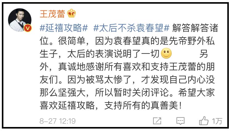上周日就已经完结的《延禧攻略》(袁春望扮演者关评论)又㕛叒上了热搜了!袁春望扮演者王茂蕾表示因被骂太惨且自己内心并没那么强大,压力之下只好暂关评论。