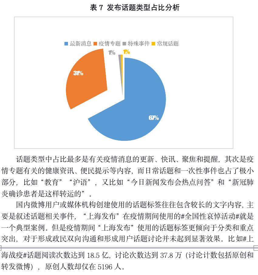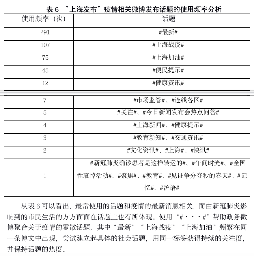 由于数据获取权限和篇幅的限制,只能从信息来源、发布频率、表述形式、内容分类和反馈程度五个方面,对上海发布在新冠肺炎期间相关的公共建设做出尽可能的分析。上述五个方面的分析表明,上海发布微博消息发布及时,话题涵盖全面,传达方式贴切,尝试构建公共话题,粉丝规模庞大,获得反馈程度较高。作为上海市新冠肺炎疫情消息的第一发出者,上海发布微博受到了极大关注,能够让有关部门了解社会的关注点和公众的信息需求,但是在话题的分类使用和增加真正的双向沟通方面还有待继续研究讨论实践。