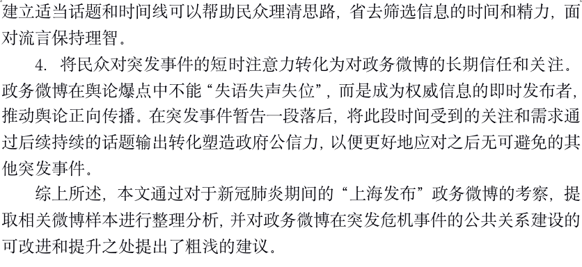 高雨叶同学的论文《突发危机事件中的政务微博——以新冠肺炎疫情期间的上海发布为例》以疫情期间的上海发布官微为例,选取了三个多月的文本进行了文本分析,呈现了政府借助新媒体针对公共危机进行的公关活动。论文论述详细,观点明晰并有实践意义。