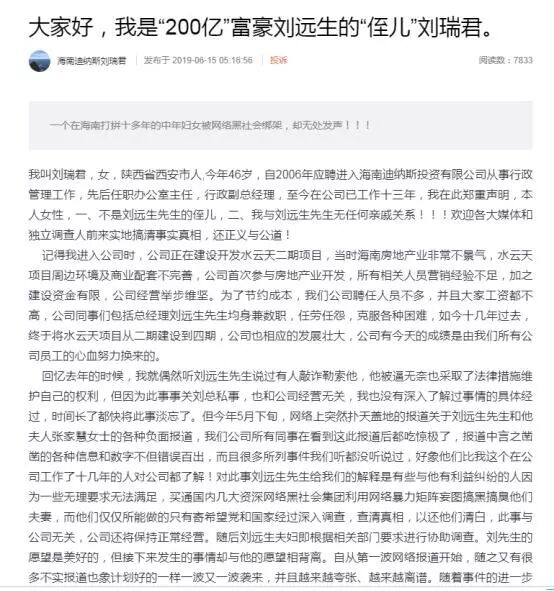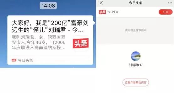 6月,海南迪纳斯刘瑞君以海南200亿富豪系列报道当事人的身份,在新浪等平台注册了认证号,直面媒体与公众,讲述她所了解的真相。6月15日,刘瑞君今日头条认证的个人号被无故删号。