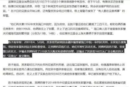 陈子南举报:2001年4、5月间,其表哥范起明因金融诈骗罪被海口中院一审判处死刑,全家如五雷轰顶。邻居张家慧和刘远生则轮番登场,让其姨妈花钱打点,她们可帮忙活动关系。其姨妈深信不疑,张家慧以此名义,诈骗走其姨妈花了310多万元购买和装修的别墅,还骗走了其表哥160万从广交会购买的大型花果山象牙雕刻。