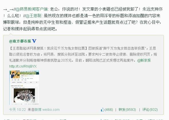 @王思聪:虽然现在的媒体也都是清一色的用浮夸的标题和添油加醋的内容来博取眼球,但是纯粹的无中生有和捏造、假冒证据来产生话题就有点过了吧?在我心目中,记者和媒体起码得有点底线吧。卸载网易客户端