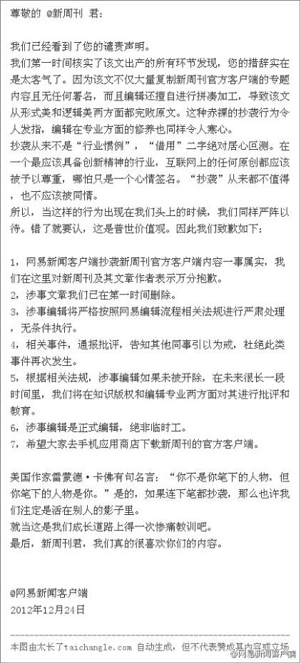 但是《新周刊》不服呀!妈蛋,明明是你家抄了我们的内容好不好。现在摆出的姿态完全是作秀给网民看,早干嘛去了?还能不能愉快地道歉了?但是作为一家在国内比较知名的杂志,新周刊如果就这么接受网易的致歉或者以再以生硬的姿态来指责,未免不够风度,其结果可能会落个网友的口诛笔伐。