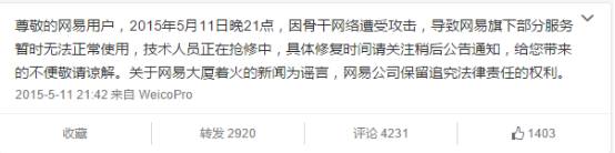 比如说,网易服务器瘫痪事件中,服务器异常后,用户抱怨、谣言肆起的时候,网易官微于21时42分发布声明,反应时间控制在一个小时内。