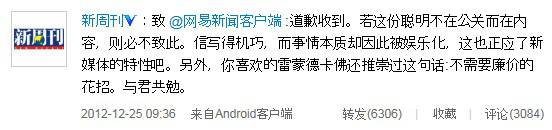 但是作为一家在国内比较知名的杂志,新周刊如果就这么接受网易的致歉或者以再以生硬的姿态来指责,未免不够风度,其结果可能会落个网友的口诛笔伐。