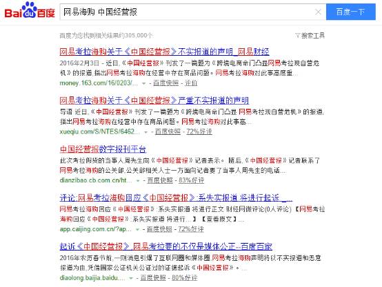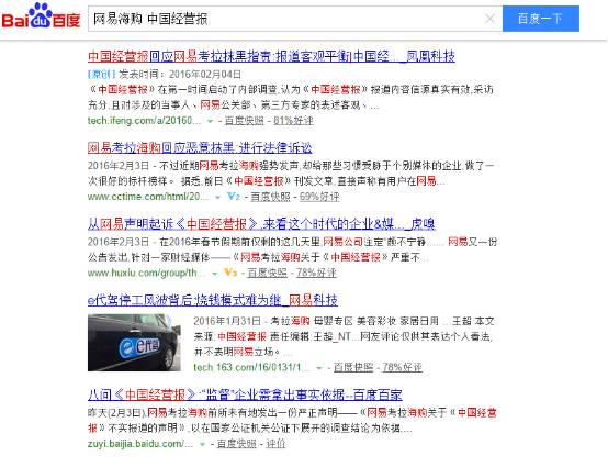 在百度搜索「网易海购 中国经营报」这两个关键词,得到的结果是这样的: