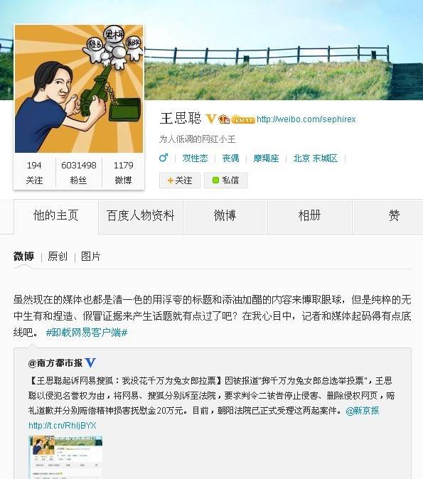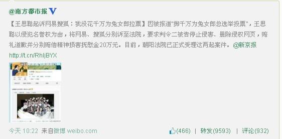 2014年9月12日,因网爆王思聪掷千万为兔女郎总选举投票,王思聪以侵犯名誉权为由,将广州网易计算机系统有限公司、北京搜狐互联网信息服务有限公司分别诉至法院,要求判令二被告停止侵害、删除侵权网页,赔礼道歉并分别赔偿精神损害抚慰金20万元。