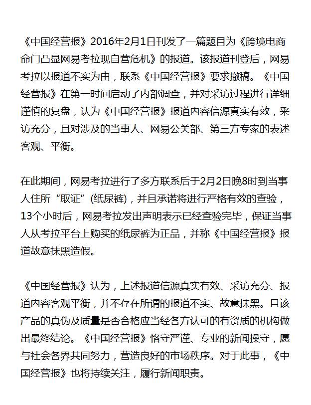 事情是这样的: 2月1日《中国经营报》刊发了一篇题为《跨境电商命门凸显网易考拉现自营危机》的报道,称网易考拉海购在经营中存在商品问题。