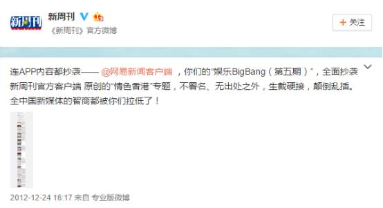 一开始新周刊指责网易新闻客户端抄袭其文章: