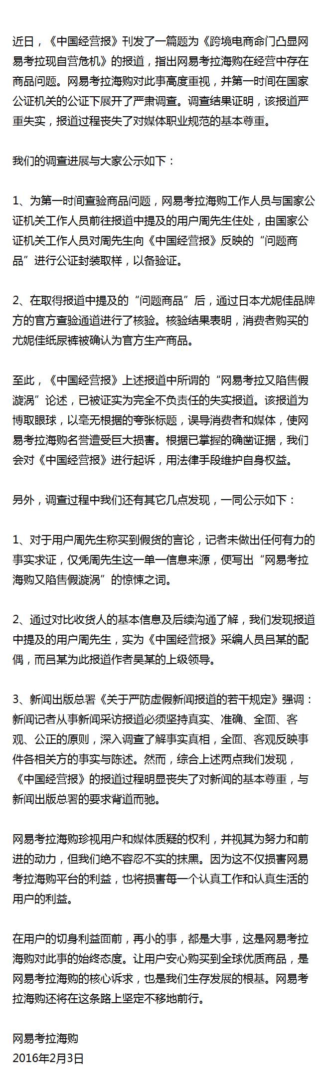 网易紧锣密鼓的展开调查,在短短两天之内迅速作出有理有据的回应。2014年2月3日下午,网易财经发布了题为《网易考拉回应中经报不实报道》的文章,称在取得中经报报道中提及的问题商品后,13个小时内就通过日本尤妮佳品牌方的官方查验通道完成了了核验。核验结果表明,消费者购买的尤妮佳纸尿裤被确认为官方生产商品。