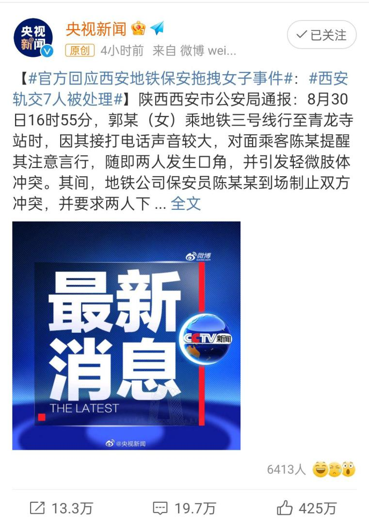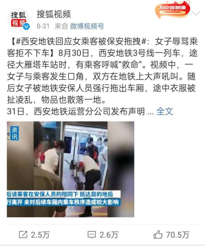 同一天,西安地铁官微@西安地铁运营分公司 对此事发表声明作出回应。9月2日,陕西西安市公安局通报处理结果。