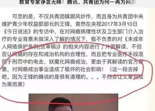 2018年6月一篇题为《教育专家诤言无昧:腾讯、共青团为何一再为网游洗白?》的文章在网上被广泛转载。这一看起来言之凿凿理直气壮的稿件,却赫然出现了一段奇怪的话,是一句用括号标注的编辑意见:这一段去掉吧。因为王锋的确说的是很有道理的……不然会让文章变成为黑而黑。