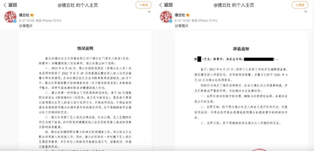 陈霄华出事后,德云社第一时间发布情况说明,称因其无端醉酒生事,酒后擅自闯入邻居住宅,已辞退陈霄华。